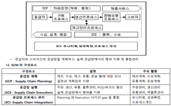 1. 정의 물품의 공급자에서부터 고객까지 거래와 관련된 정보, 자원, 자금 등의 흐름을 총체적인 관점에서 각 기업간의 인터페이스를 통합하고 관리하는 공급망 관리 1.0: 재고 감축을 통한 비용 절감이 목표 2.0: 유연성, 환경 및 고객지향을 추구하는 전략으로 변경 목적 ) Value-Chain 통합관리, 비용절감, 수익증대, 효율성증대 2. 구성요소 - 계실관(계획, 실행, 관리) PEI 3. 채찍효과 (Bullwhip Effect) - JIT(Just In Time), 제품 추적, 이력관리를 통해 채찍효과 해소