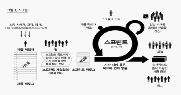 1. 정의 팀 개선과 프로젝트 관리 위해, 작은 개발팀과 짧은 기간의 점진적 반복적 개발을 통한 애자일 프로세스 번다운차트를 통한 성과관리, 프로젝트를 스프린트(30일 단위 iteration)로 분리 2. 스크럽 프로세스 및 구성요소 가. 프로세스 - 서비스 별로 서비스 분류 및 팀 구성 후 Sprint 점진적 진행 나. 구성요소 - PB-SB-S-DM-SR-회-번 [절차] Product Backlog 미팅 -> Story Point 산정 -> Sprint backlog 작성 -> sprint -> daily standup metting -> sprint review -> retrospective review(회고) - sprint 진행 중 작업 추가 불가능